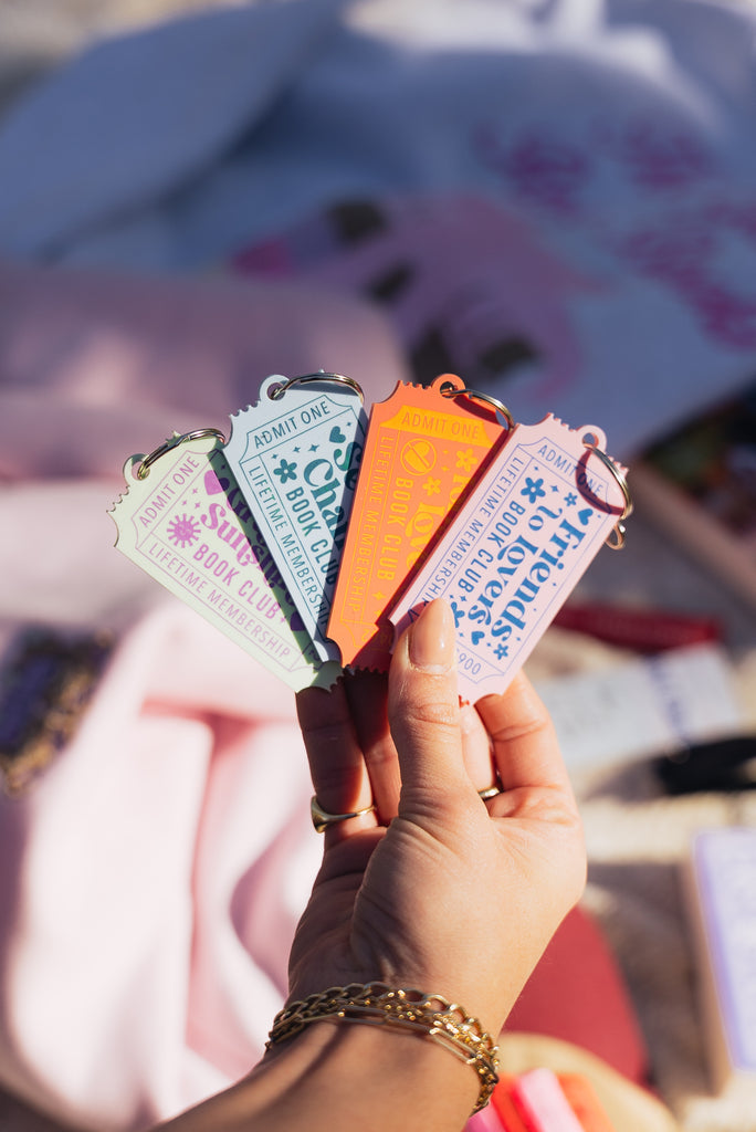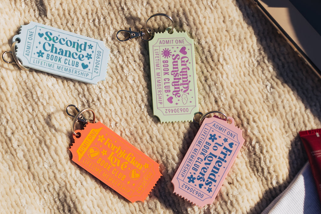 movie ticket style keychains with book tropes // lifetime membership // measurements 6in x 5in x 2in