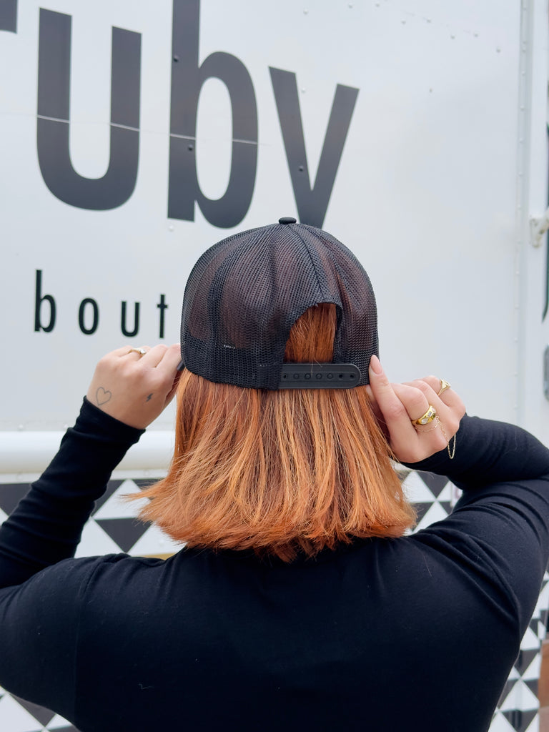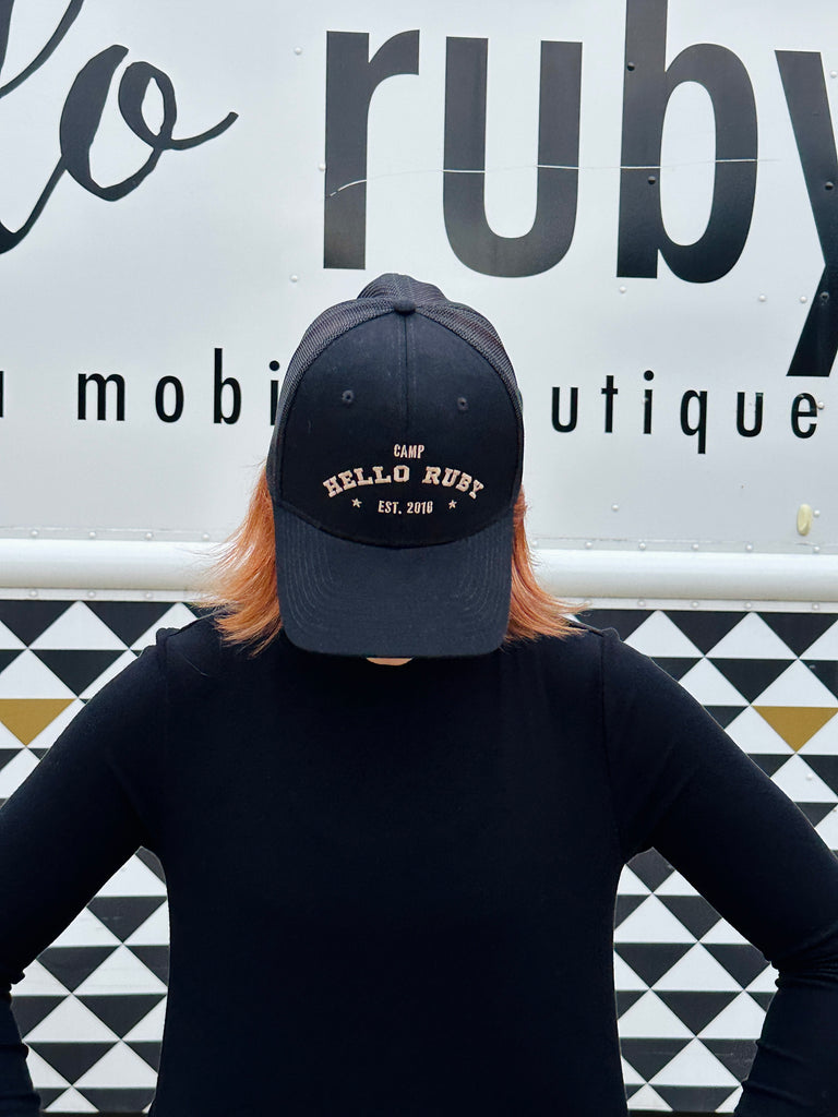 fall is camping weather!! // whether your camping, glamping, or just wanting to rock some hello ruby merch, this is go to hat // trucker hat style // embroidered // mesh back // adjustable back