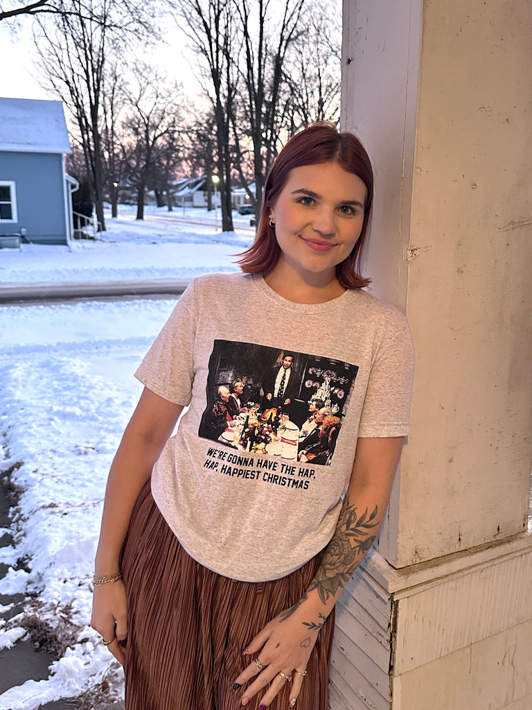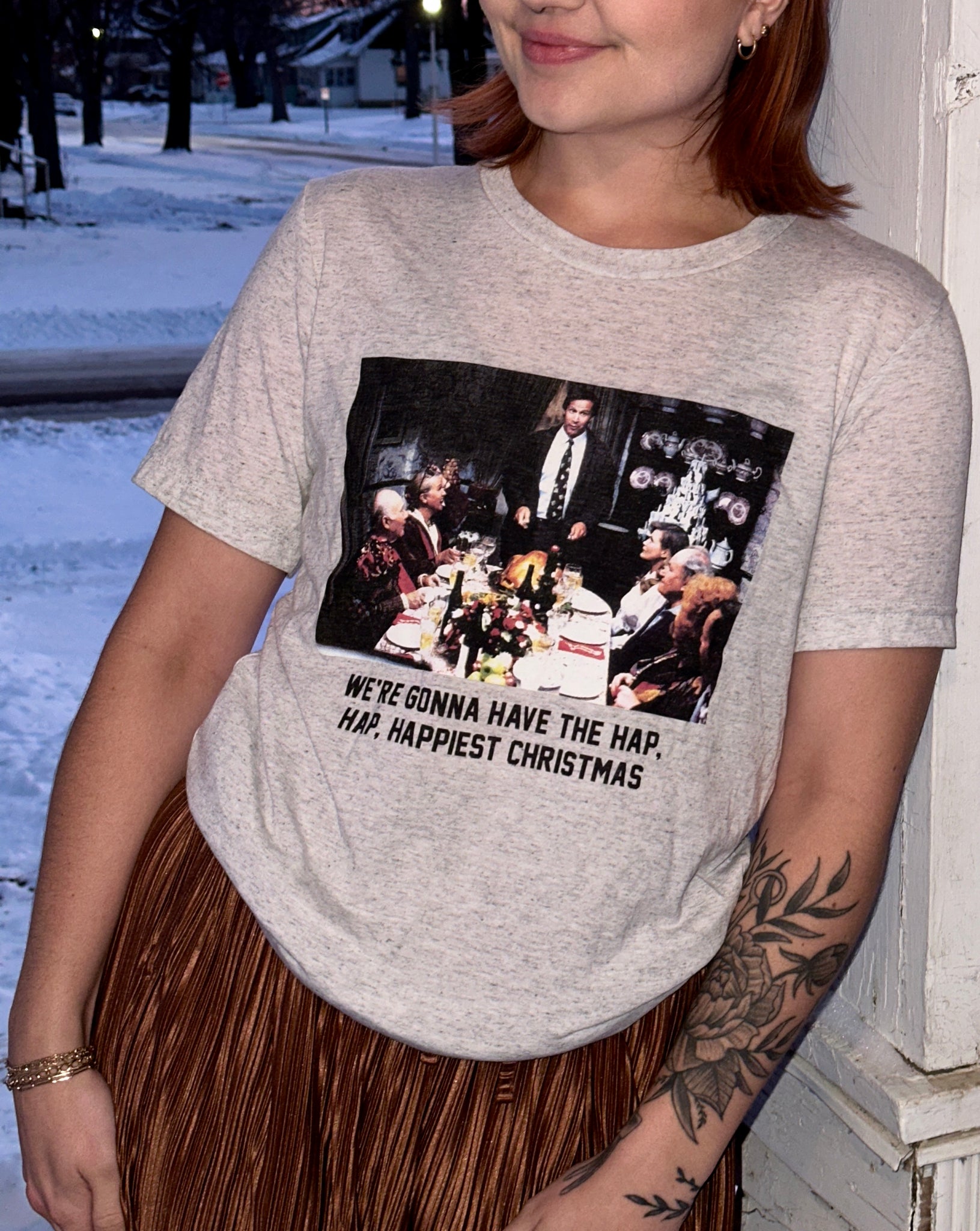 $34.00heather light grey tee // lightweight // national lamboon's christmas vacation iconic thanksgiving scene // "hap, hap, happiest christmas" // true to size