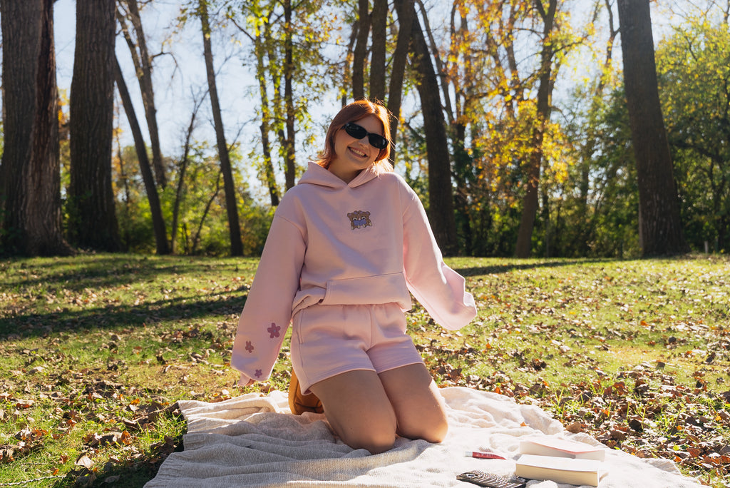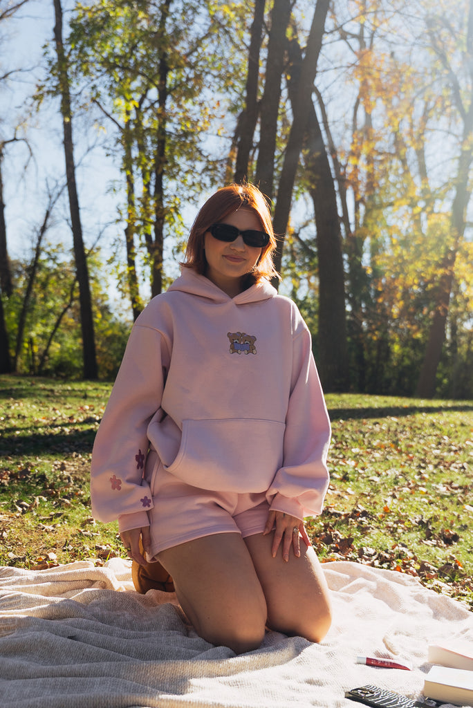 $58.00matching lets read together shorts // little bears reading in the corner // pockets // stretchy waistband // soft pink // embroidered // true to size