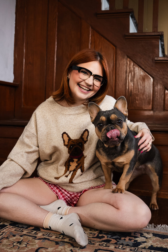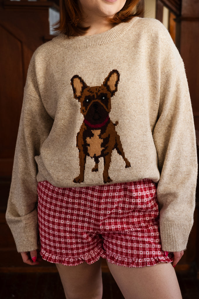 $58.00our favorite frenchie is named Ru // sweater designed specifically for here // roomy fit // beige sweater with a brown french bull dog