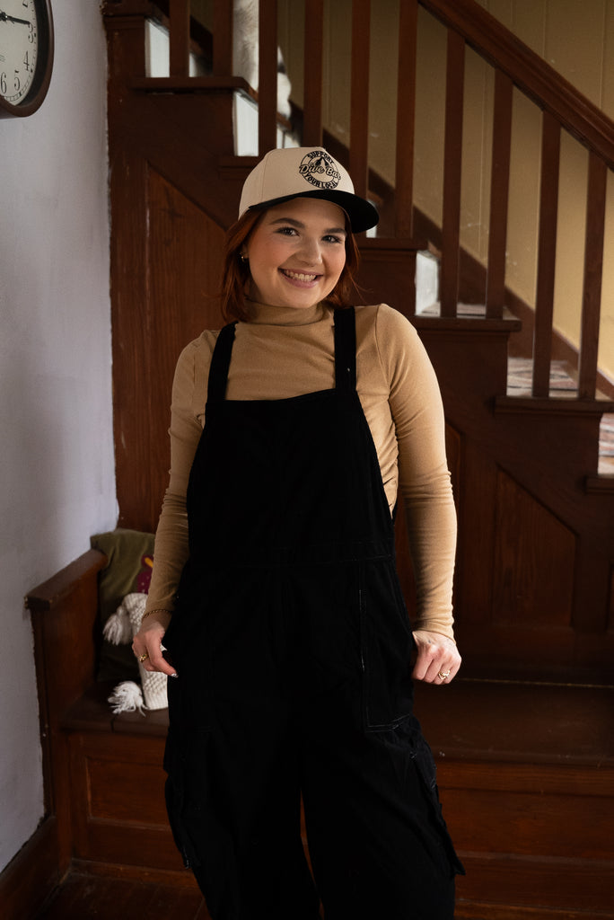here for the tall girlies // long jumpsuit corduroy overalls // zipper on the side // slouchy, baggy legs // can tighten the bottom // side pockets // layered with the cider side top