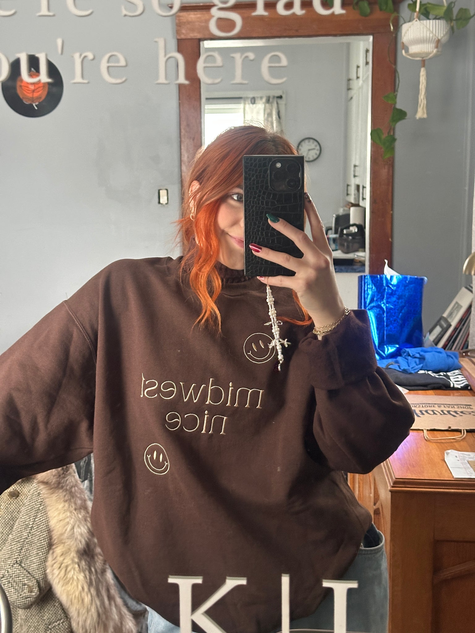 you know what they say about midwest people being the nicest // cream or brown colored & embroidered work // designed in house // true to size