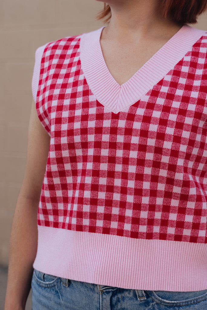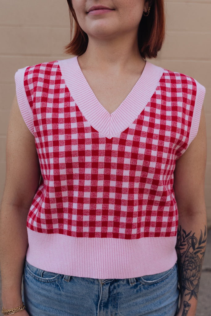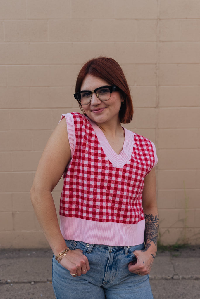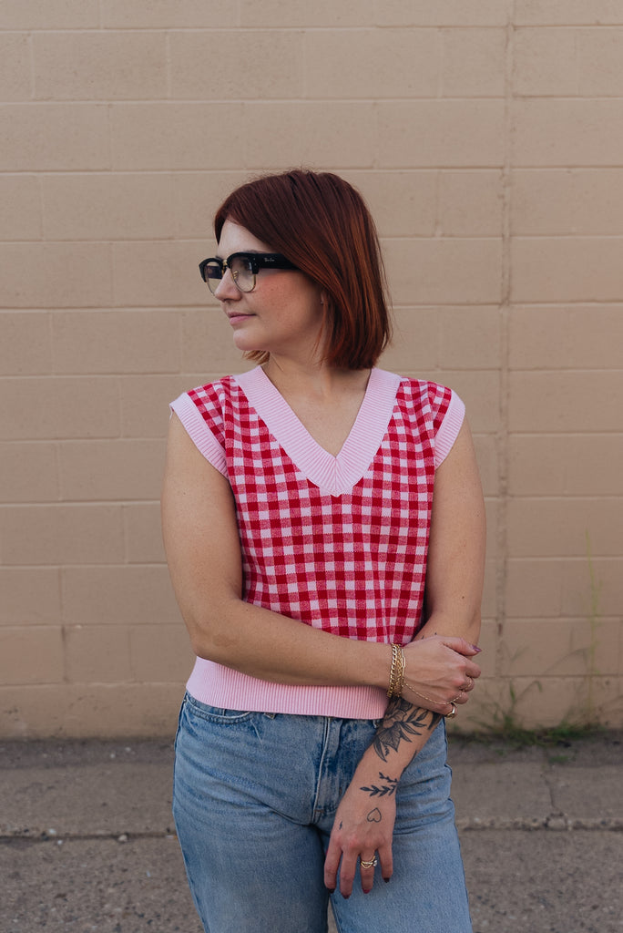 $58.00the actual most perfect sweater to add color into your fall wardrobe // sleeveless // red and pink checkered pattern // not cropped // roomy fit // true to size