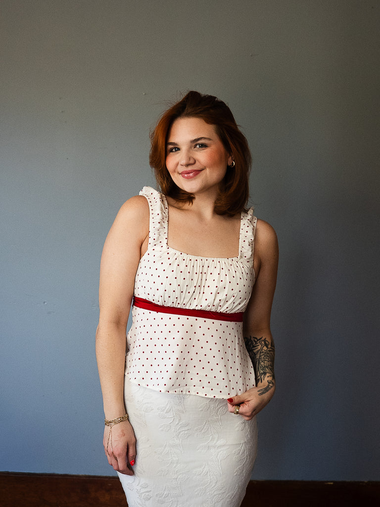 cream polka dot top with ribbon detail + tie bow on back // slightly cropped // cinched sleeves // maroon/red polka nots // runs a tad small