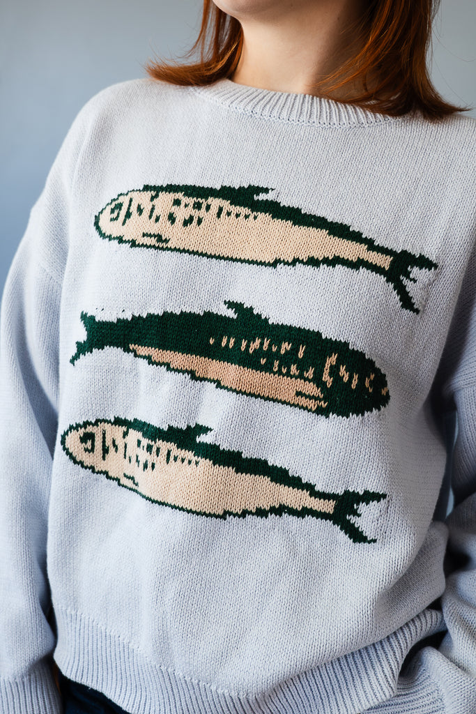 $56.00gorgeous light blue sweater with the cutest 3 sardine fish on the front // green & beige sardines // roomy fit // size up for an oversized fit // material - 60% cotton & 40% acrylic