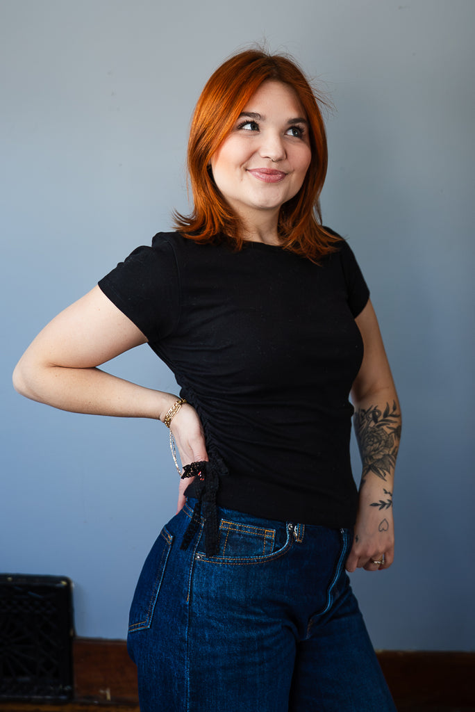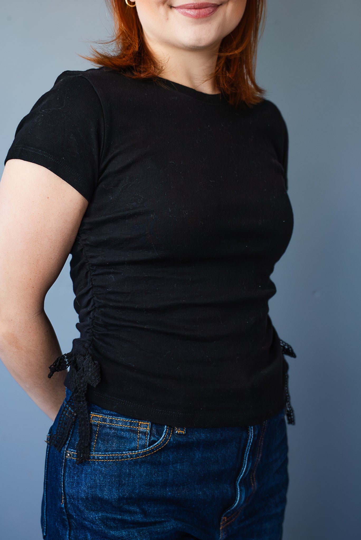 basic with a twist // black fitted plain shirt with lacy bow and ruching details on each side // fitted fit // true to size fit // material - 100% cotton