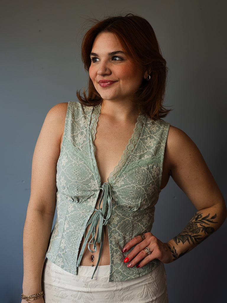 blue/green white lacy tie top // pair on its own or wear on top as a vest // two ties in front // runs a tad small